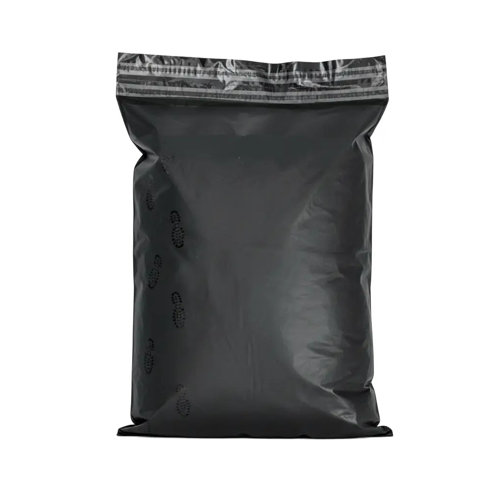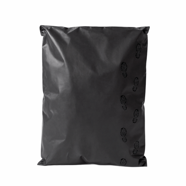 De Webshopzak Mat Zwart Shoe Print 45 x 60 cm is gemaakt van extra sterk COEX-materiaal (70 micron), volledig ondoorzichtig, scheurvast en waterafstotend.